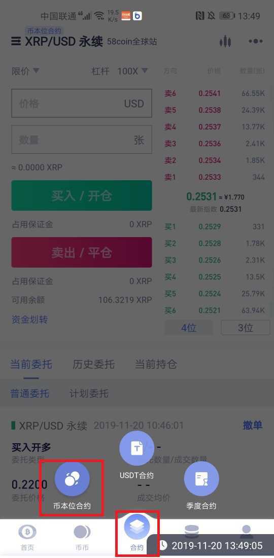 通过"我的-转账"功能将其他账户资金转入合约账户,系统支持XRP等8大币种,内部转账零手续费。