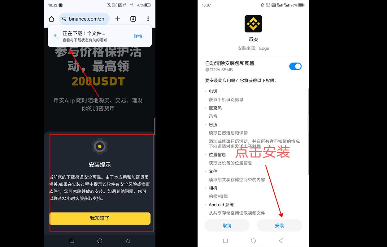 点击“Android”或“APK下载”按钮。浏览器会下载币安APP的安装包(APK文档)。重要安全步骤:下载完成后,在安装前,强烈建议核对APK文档的数字签名是否来自币安。对于大多数用户,至少确保文档名类似Binance_vx.x.x.apk(x.x.x 是版本号)且是从官网直接下载的。