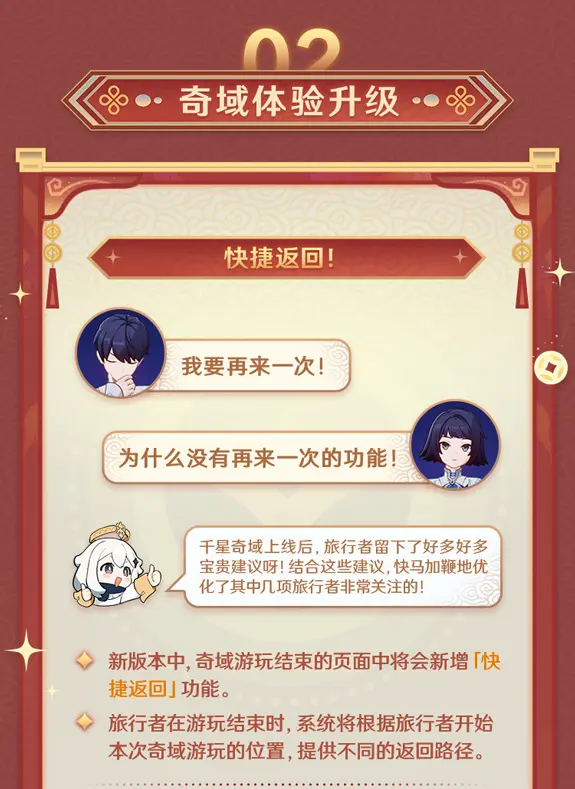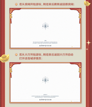 旅行者在游玩结束时,系统将根据旅行者开始本次奇域游玩的位置,提供不同的返回路径。