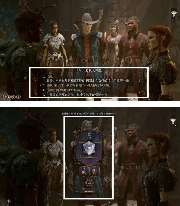 3、接着下个选项根据对话个人能力考虑投骰子,游说的骰子下限是12点,成功骰子后,左上角可以看到队友对此此选择的好感度增减情况;