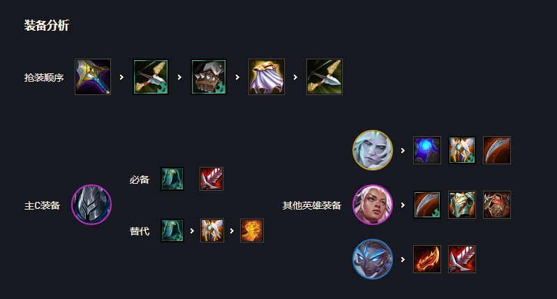 优先武器的饮血、黑暗水银、火炮或者正义,前排芮尔给肉装便可,最好龙牙反甲,巨魔可以给旗子站在贾克斯边上,佛耶戈复活甲、蓝霸符、龙牙,法爆也可以。