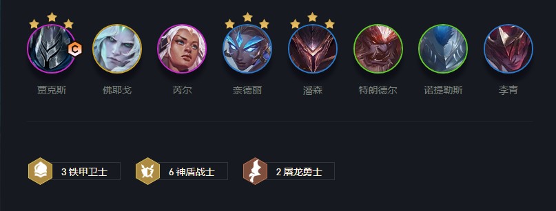 这个阵容是看血量和经济决定几人口D卡,如果到4/1血量低于六十血,那么我们就要小D二十块左右搜出质量,外加找一张贾克斯来锁血,当然开出六盾最关键,稳住血量拉到八口开始大D场上卡都D到二星,最关键二星贾克斯其他还好,开出三铁甲也比较关键,这时候看我们来卡情况,如果贾克斯较多可以考虑八口D三星,如果不多稳住拉九找个神王上或者二星大熊也不错。当然八口有佛耶戈也是质的提升,肉装直接给跳后排转化有奇效。