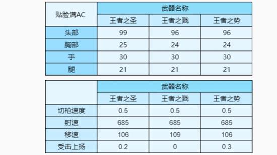 可以看到这三款武器都有不一样的亮点,喜欢二连加泼射的可以选择王者之圣这把武器;想体验无比持久的连杀延时的可以入手王者之戮,虽说其数据可能没有第一档王者M4这么亮眼,但是手感还是很不错的;而王者之势这把武器,强度肯定是有的,但是其缺点也是众所周知的,对枪时极其容易被打飞,这把武器适合习惯速点加二连发打法的玩家。