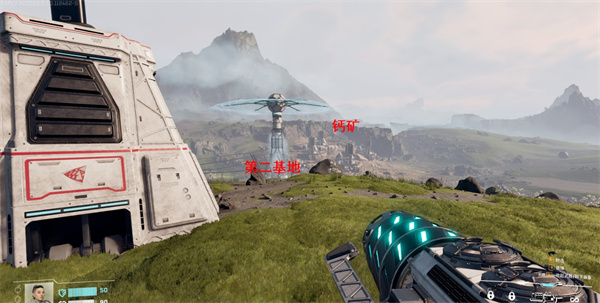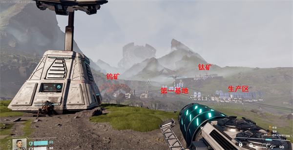 就沿着这个大致方向一直往前走,直到坡上有个很显眼的机械建筑,再往前看,左边是两个拱门一样的钨矿,右边是平台一样的钛矿,两个矿区中间就是第一个基地的位置。