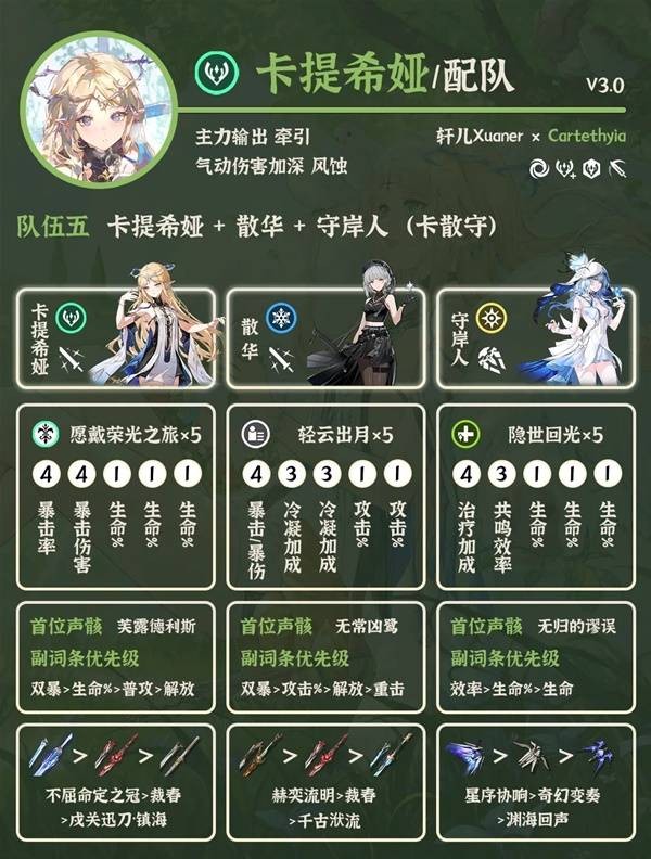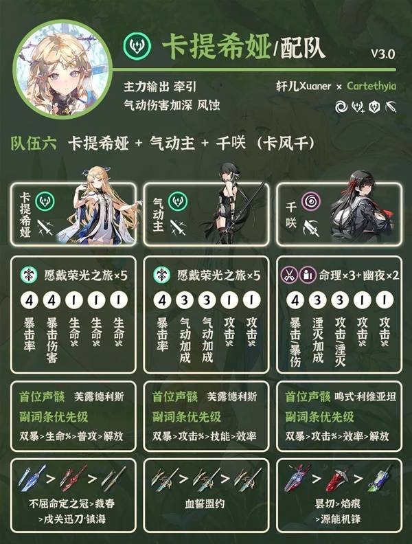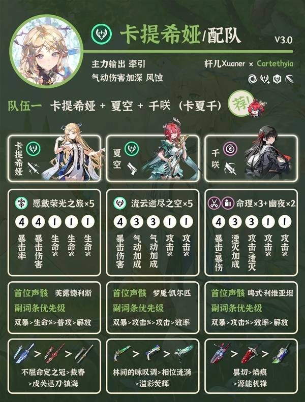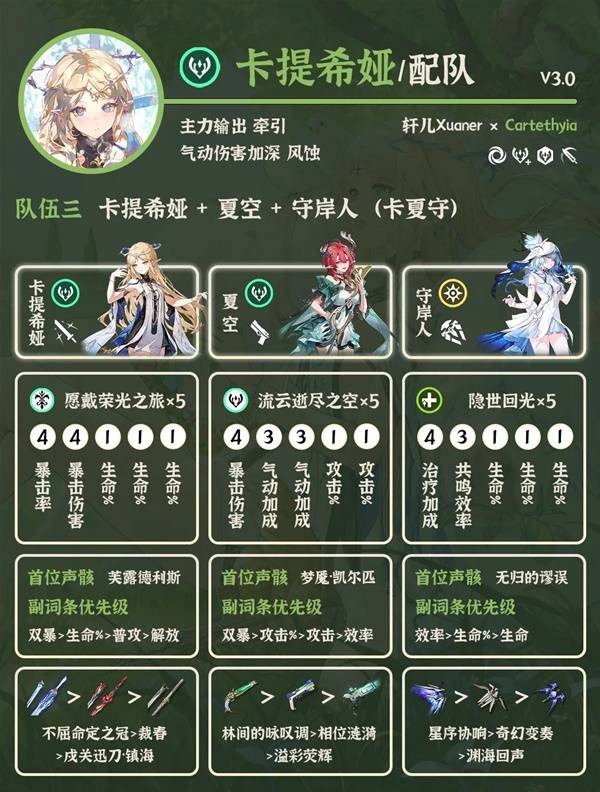 ③卡提希娅+夏空+守岸人:这个配队比较适合冥歌海墟,在多波怪的情况下,风蚀效应可能叠不到太多层,守岸人快速协奏更好点。