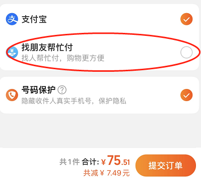 选择心仪商品后进入结算页面,在支付方式中选择"找朋友代付"功能。