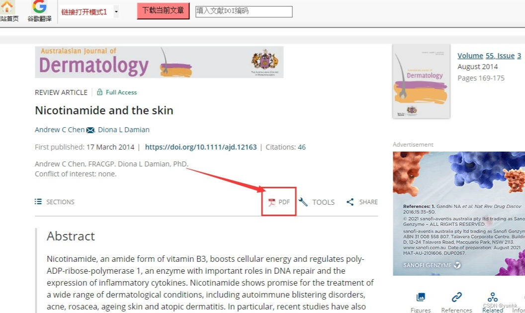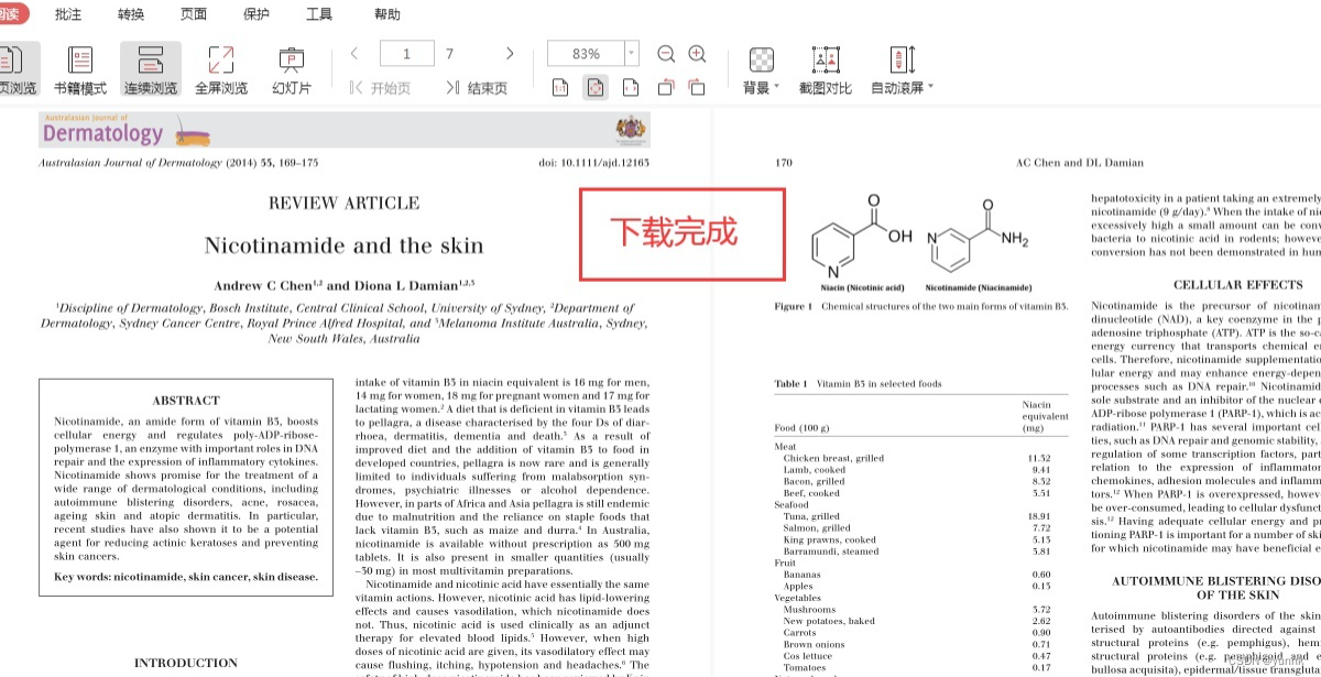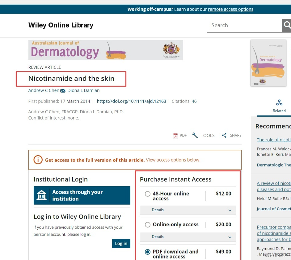 以文献"Nicotinamide and the skin"为例,当遇到付费墙时: