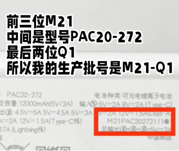 查询生产批次无需保留包装,只需查看充电宝底部编码即可完成识别。以示例编码M21PAC20272111Q1为例:前三位M21代表批次前缀,中间PAC20-272为产品型号,最后两位Q1为批次后缀,组合后完整批次号为M21-Q1。