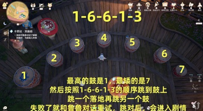 按照给出的1-6-6-1-3的顺序,依次跳到鼓上,跳到地上也没关系;