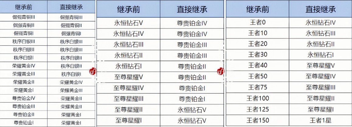 以上,就是S42新赛季排位段位继承的情况了,星耀会掉至钻石铂金、王者39星以下掉至钻石、新增125星段位继承;最后,S42新赛季段位继承,是以S41当前段位来结算,千万要注意!