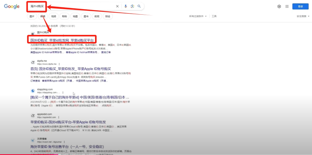 我们可以打开谷歌,记得一定要打开谷歌,不要百度,百度是找不到的。搜索一下“美区ID购买”,或者是“海外ID购买”都是可以。价格也是很便宜,基本上几块钱一个,大家可以筛选一下,这里就不再给大家演示了。