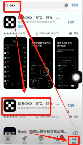 点击右下角的搜索,在搜索框输入OKX。搜索结果的第二个黑底和五个白色的方格就是欧易OKX的图标,直接下载就可以了。我这里是下载过了。