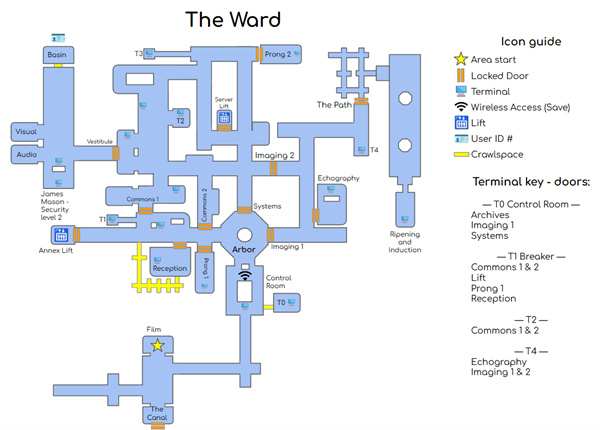 右侧的地图键包含了断路器端子,以及它们供电的门。门的名字尽可能靠近锁着的门图标。试着把实体A锁定在他们身后!