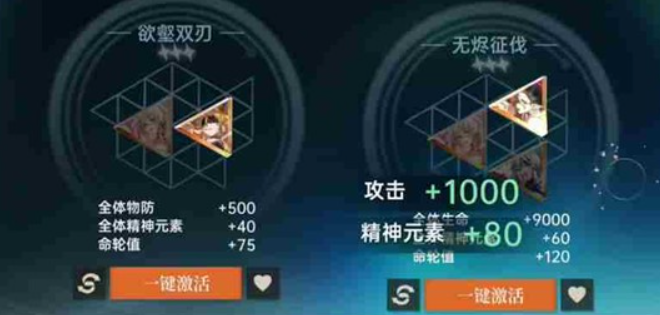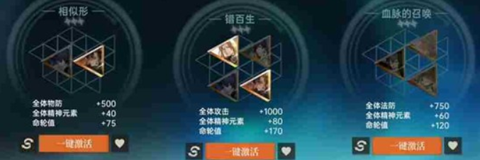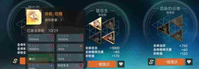 命轮系统的核心功能在于元素转换。以需要精神元素的绘梨衣为例,命轮“错百生”中包含了路明非、恺撒、楚子航和源稚生。前三位角色并非精神元素属性,单独点亮无法提供精神元素加成。但通过点亮作为精神元素角色的源稚生所形成的羁绊,可以将其他三位非精神元素角色的属性全部转换为精神元素。