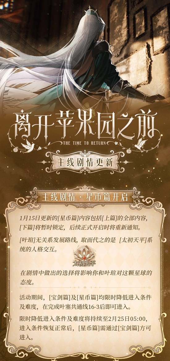 时空中的绘旅人离开苹果园之前·主线活动将于1月15日开启~活动期间,[宝剑篇]及[星币篇]均限时降低进入条件及难度,在完成叶塞共通线16-3后即可进入。那么这一玩法有些什么呢?为你准备了一份攻略,一起来看看吧~