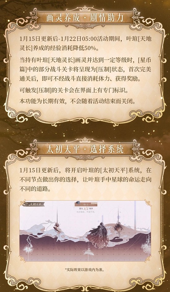 1月15日更新后-1月22日05:00活动期间,叶瑄[天地灵长]养成的经验消耗降低50%。