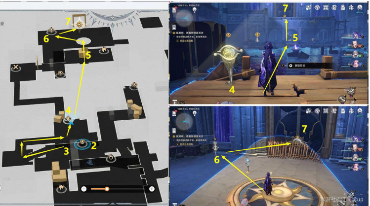 (2)接着先去4位置获取符文,然后从前面5位置坐电梯上去,去上面6位置放回符文后再进入7位置的大门