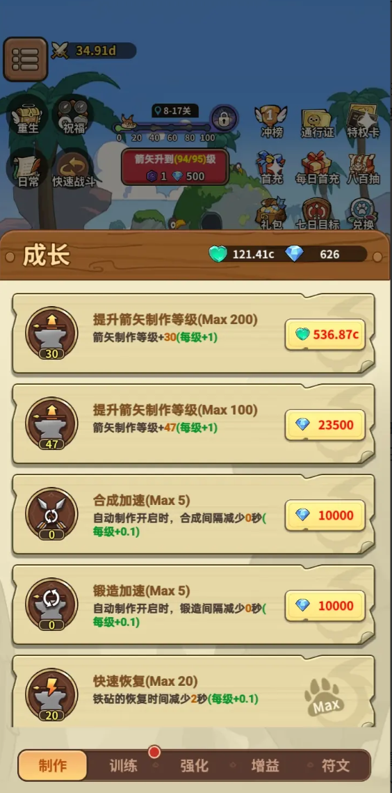 除英雄体系外,精灵系统同样影响战局走向。合理筛选并重点培养关键精灵,能显著提升战斗效率。例如喜箭必须升至满级,以保障基础箭矢产出稳定性;若追求更高爆发输出,则乐芙兰是箭矢制作等级提升路径中的优选精灵。此外,钻石、红钻、黑钻等核心资源需按优先级精准投放——避免平均分配,优先保障主力英雄突破、关键精灵升星及技能解锁等刚性需求。