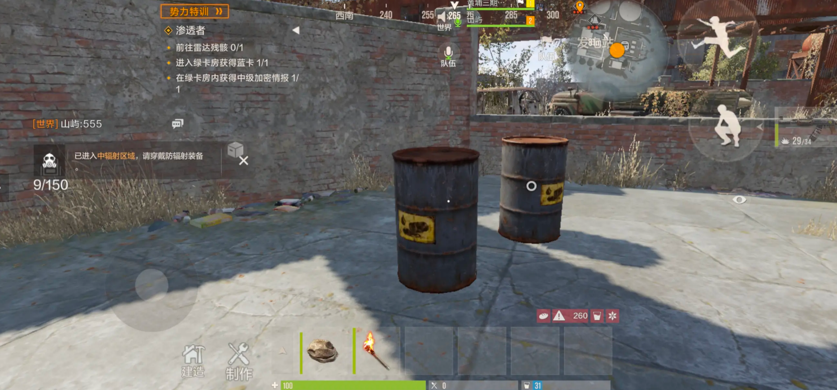 最后说说油桶的获取,这个东西是矿场采集的必需品。不同威胁等级的据点产出数量不一样。低威胁的大铁球据点,在铁球最顶端有两个油桶。中威胁的发电站,在电梯口旁边能找到2个。高威胁的火箭发射基地,左下角位置有一个。小型油井钻井平台这个地方比较特殊,每一层都会刷新油桶,加起来最少有4个。