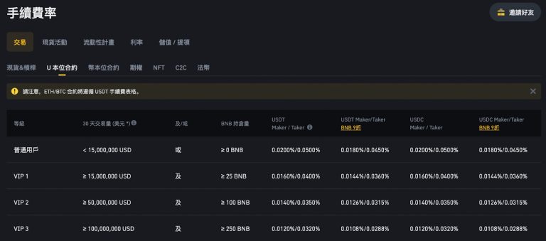 U本位Maker费率0.02%,Taker0.05%。BNB可折抵10%费用。资金费率是隐藏成本,需特别关注。
