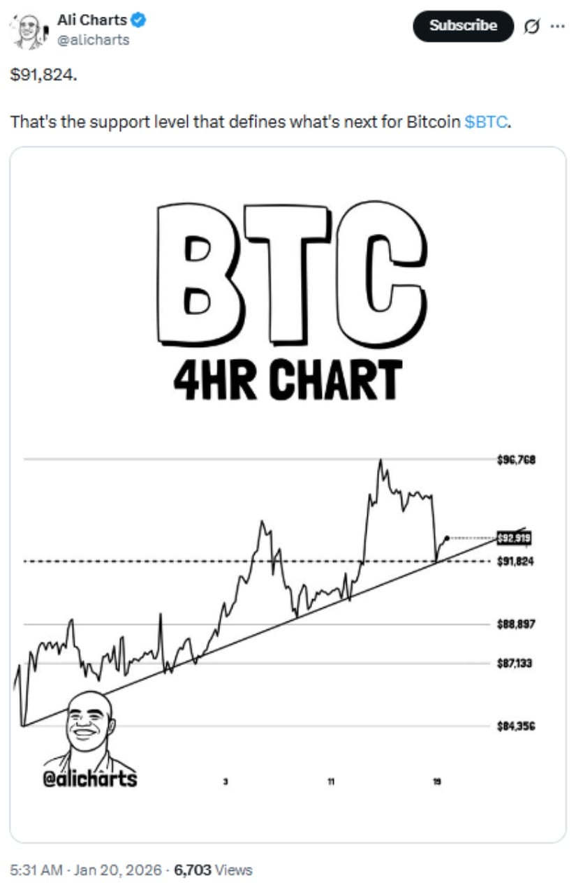 分析师Ali Charts指出91,824美元是4小时图上的关键比特币支撑位,当前BTC正于91,670美元附近测试该水平,若坚守则预示短期谨慎看涨潜力。来源:Ali Martinez via X