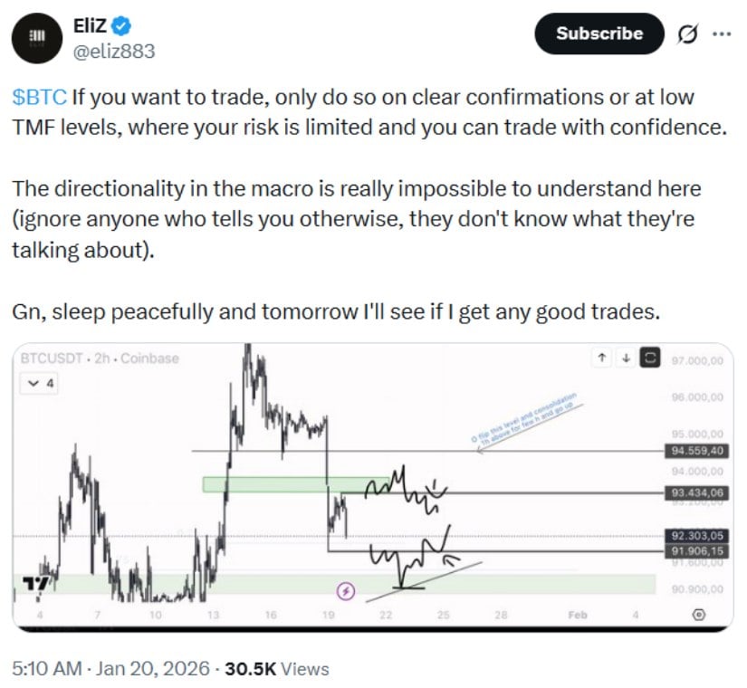 鉴于宏观方向未明,交易BTC需等待明确确认信号或低风险TMF水平,避免对市场预测过度自信。来源:EliZ via X