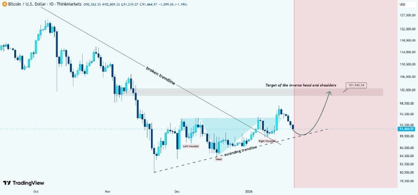 比特币头肩底形态暗示,若上升趋势线支撑有效,价格或谨慎看涨至10-10.2万美元。来源:melikatrader94 on TradingView