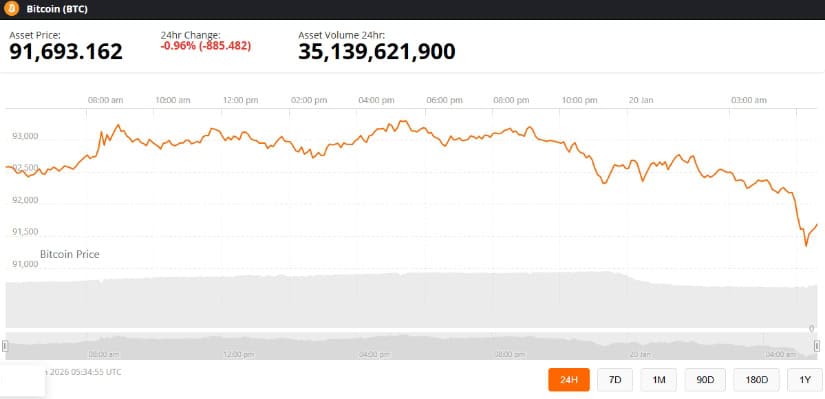 截至发稿,比特币报91,693.16美元,24小时下跌0.96%。来源:Brave New Coin比特币价格