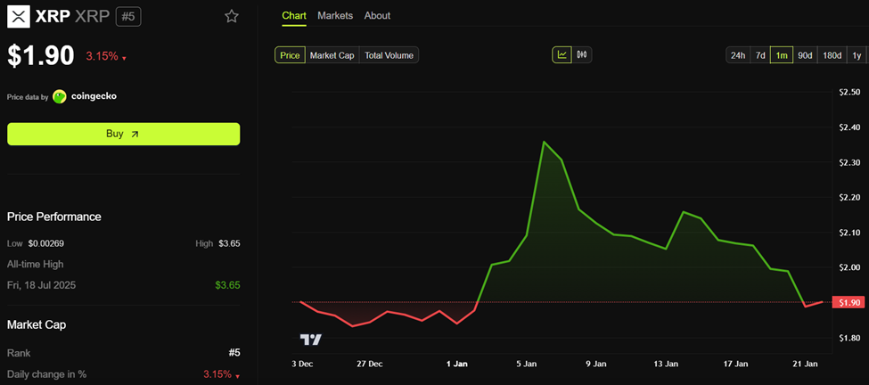 尽管愿景宏大,市场反应平淡,XRP价格下跌超3%至1.90美元,跌破2美元关口。