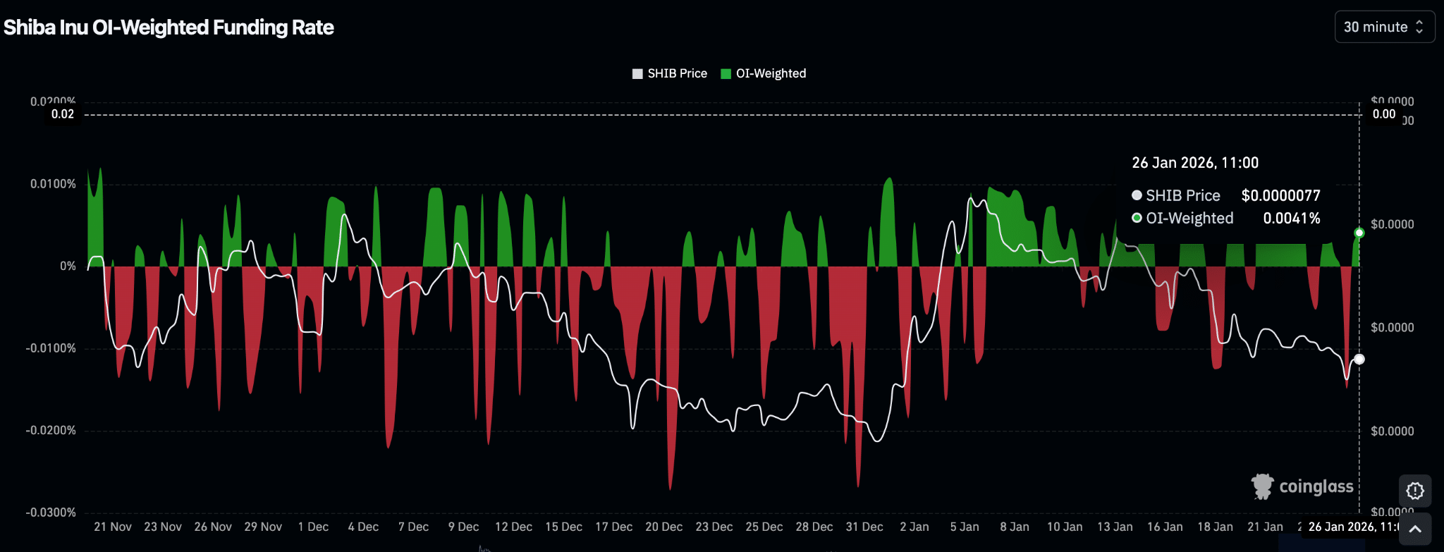 另据数据显示,SHIB持仓量加权资金费率近期多在零轴附近震荡,正负值频繁切换。1月初价格短暂反弹期间,资金费率持续为正,表明杠杆多头占优需向空头支付费用。