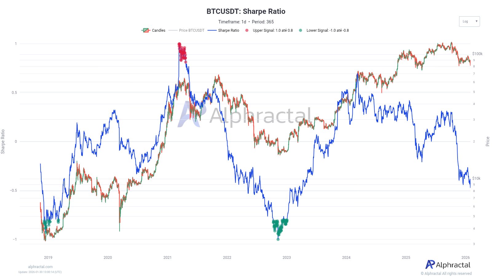 Alphractal创始人兼CEO Joao Wedson于1月30日在X平台发文指出,比特币夏普比率正以快于价格的速度下跌。该比率用于衡量特定加密货币(此处指比特币)的风险调整收益。