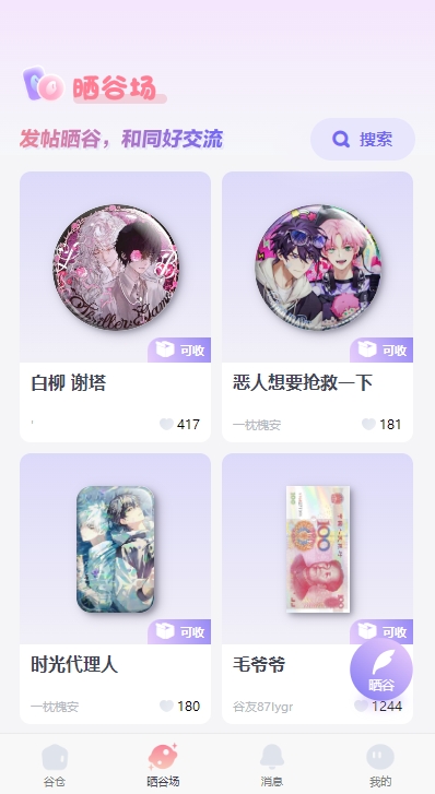 谷圈goodsquan是一款专为吃谷人用户们打造的平台,每位用户可以将自己的谷子分享在这里,创造自己的虚拟谷子,随时可与朋友分享、交流,结交更多同好用户,随时可自定义的创作和分享,超丰富的素材库任你选择,借助工具快速生成。