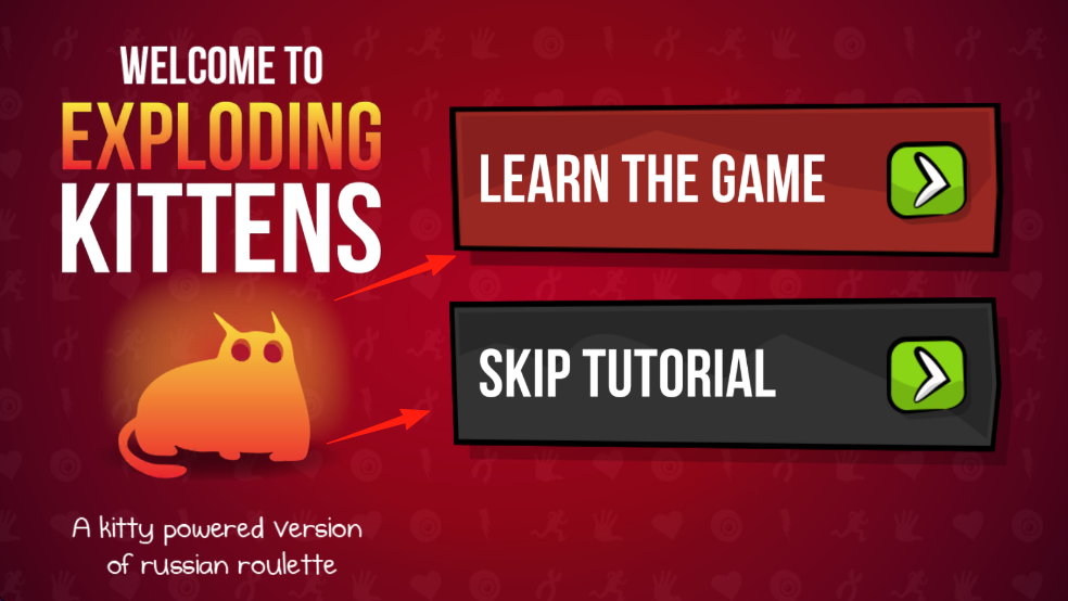 1、打开ExplodingKittens游戏,若想了解游戏规则,点击LEARNTHEGAME按钮进入教程;若已熟悉规则,点击SKIPTUTORIAL按钮跳过教程。