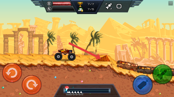 3、操控怪物卡车,行驶时注意避开障碍,收集道具(如宝石),利用右侧技能按钮(如火箭)增强能力。