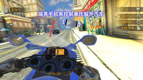 3、依据提示,通过摇晃手机操控摩托车,按箭头方向躲避路上汽车。