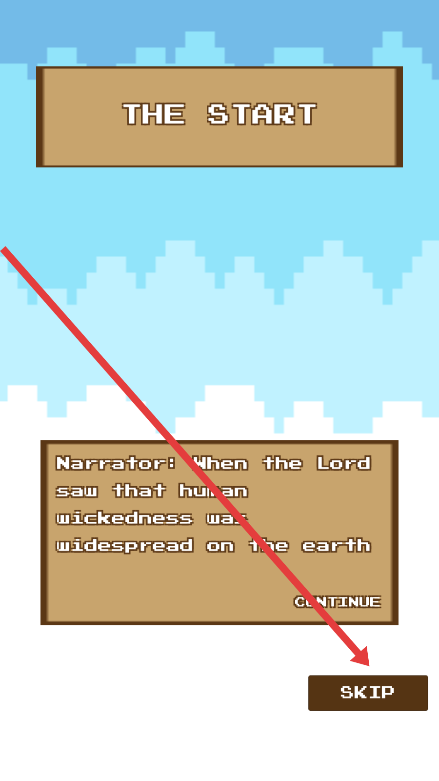 2、若不想观看开场剧情介绍,按箭头指向,点击“SKIP”按钮跳过剧情,直接进入游玩关卡选择界面。