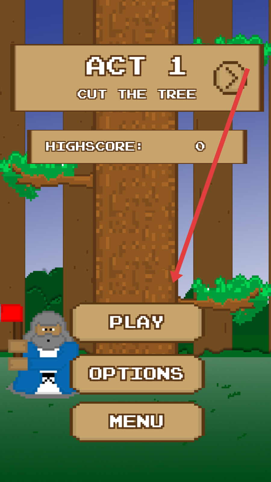 3、在关卡选择界面,按箭头指示,点击“PLAY”按钮,开始“ACT-1-CUT-THE-TREE”关卡游玩,体验游玩具体玩法。