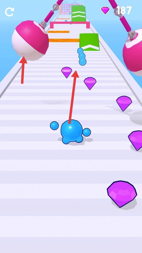 2、在前进道路上,注意躲避如粉色大摆锤、橙色陷阱区域等障碍物。