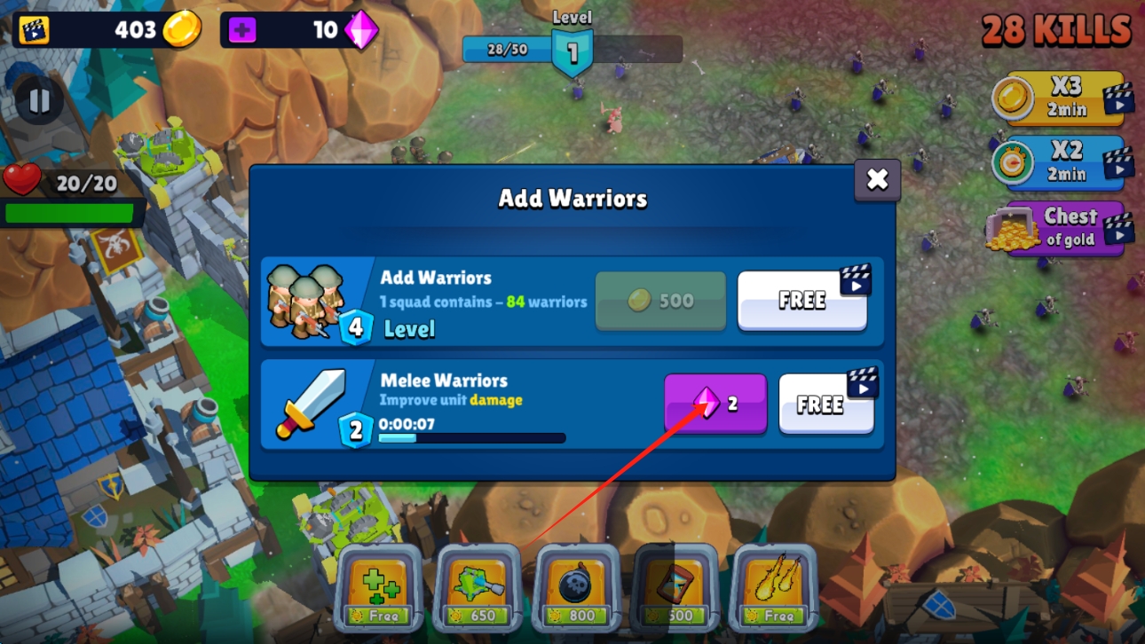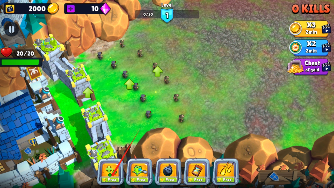3、成长系统:通过完成关卡获得经验值提升等级,解锁新防御塔与技能,使用金币购买基础资源,钻石可购买高级装饰与加速升级,支持观看广告免费获取随机资源。