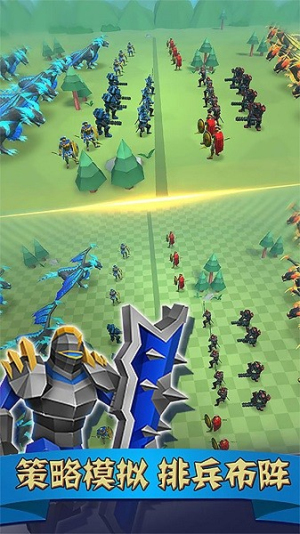 2、简约美术风格,采用低多边形建模,突出战场信息的清晰呈现。不同兵种以鲜明色块区分,技能范围以半透明色域标注。