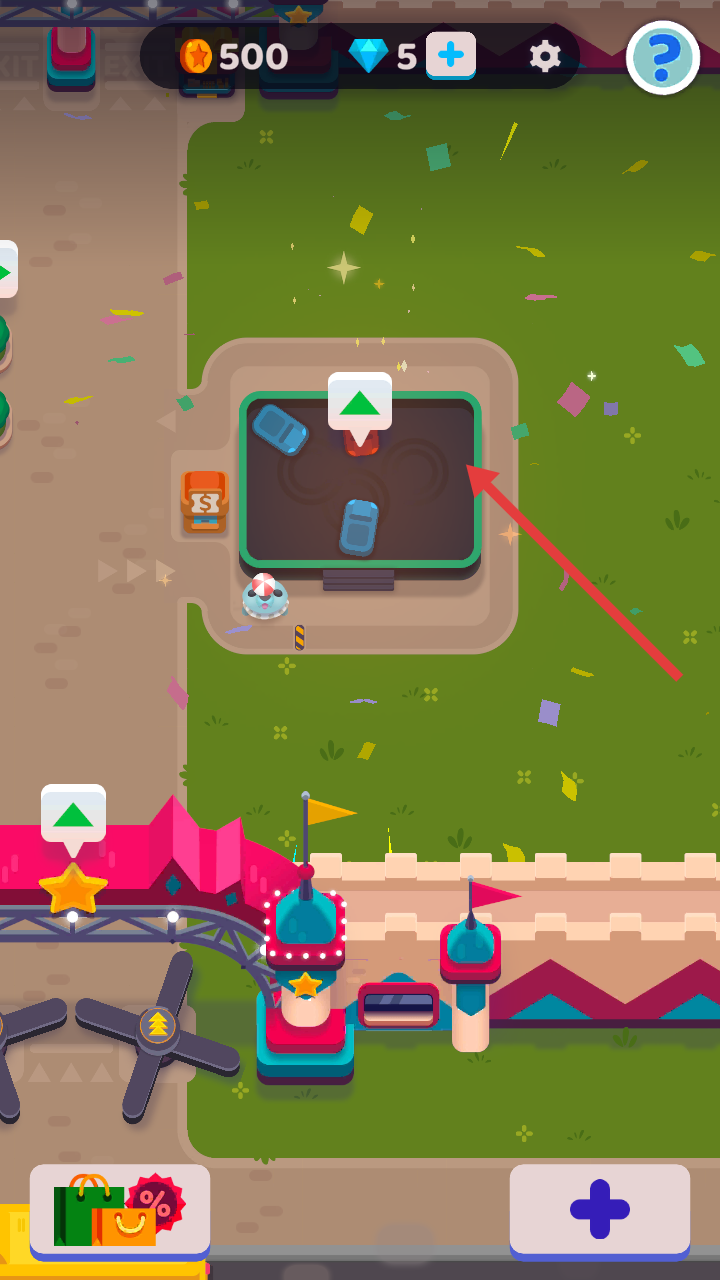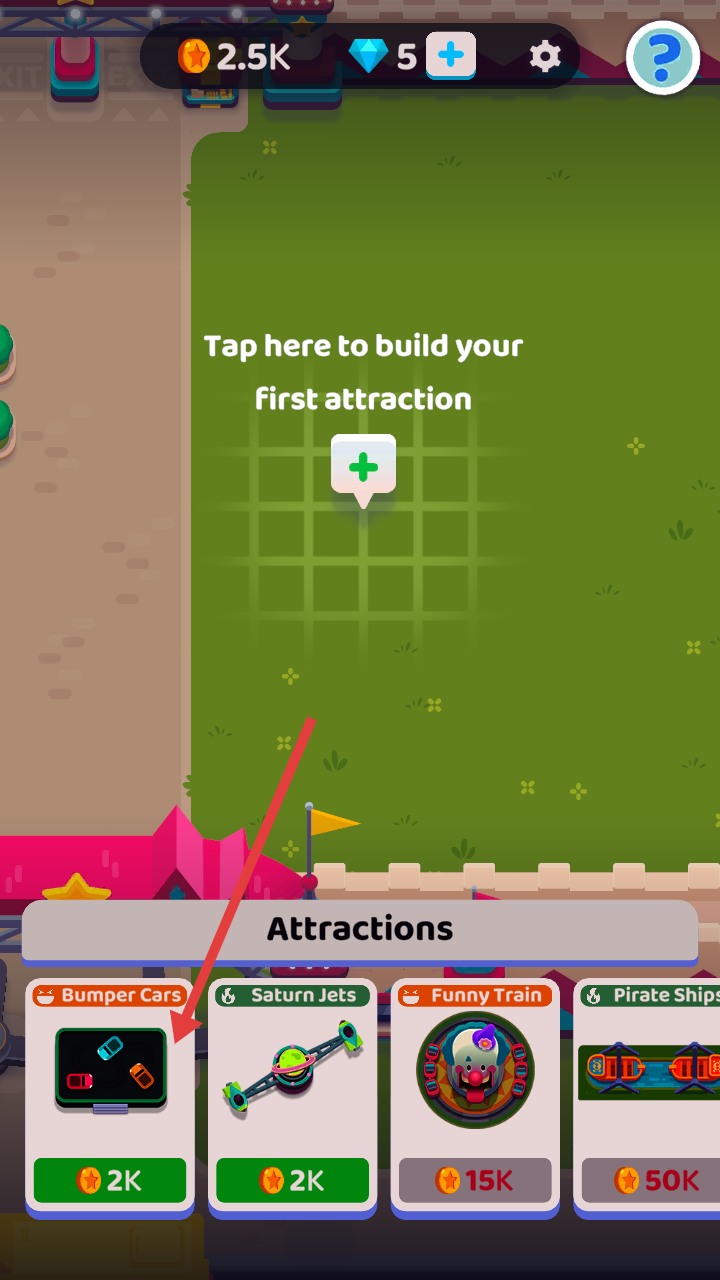1、进入游戏界面,看到提示,点击绿色【+】按钮,开始建设首个游乐设施。