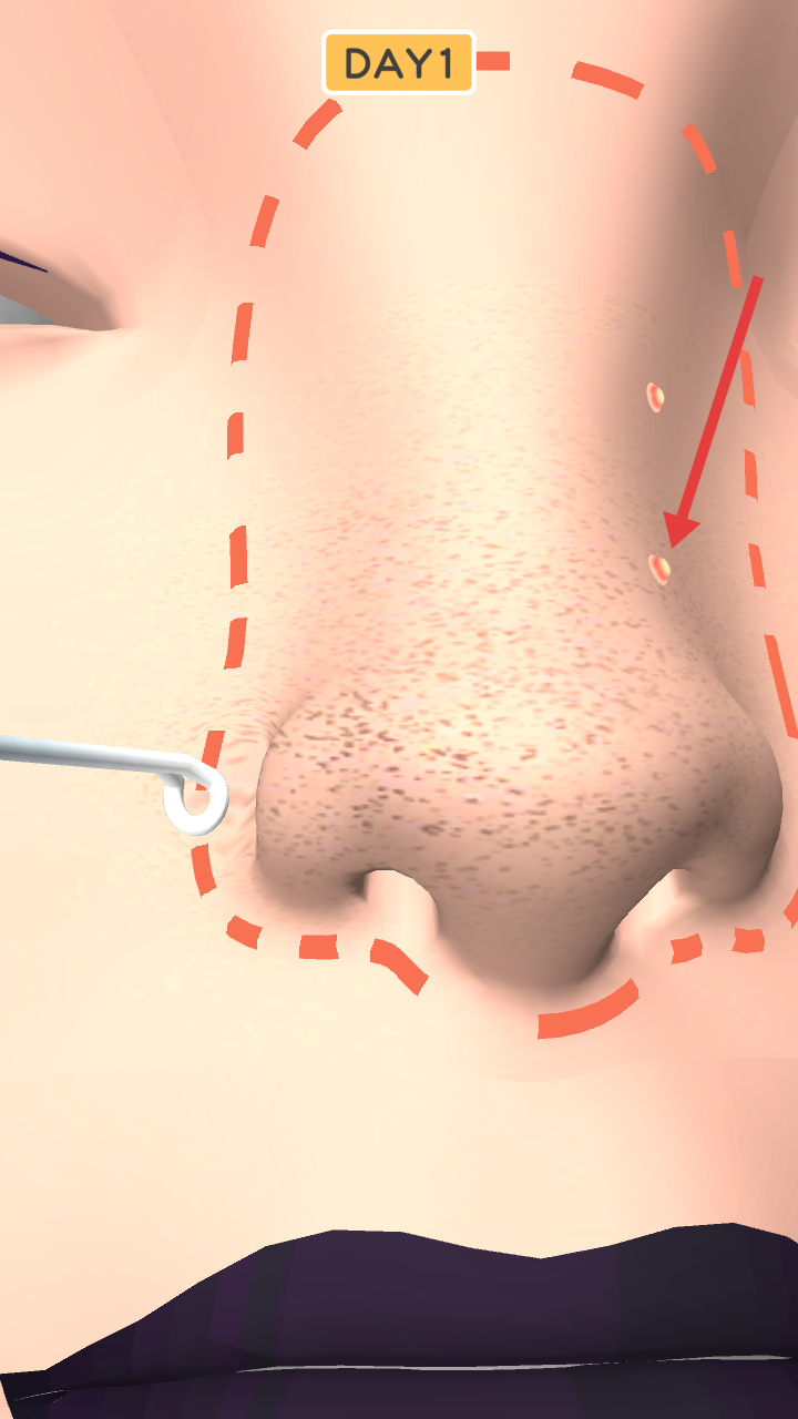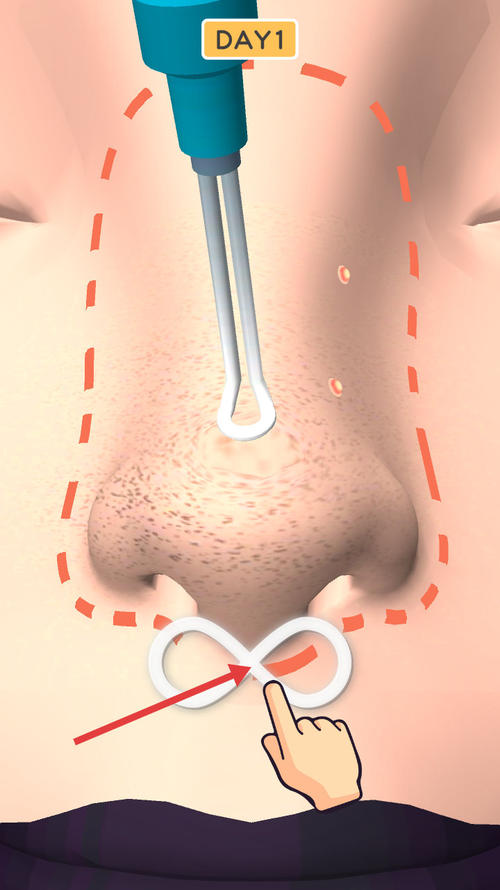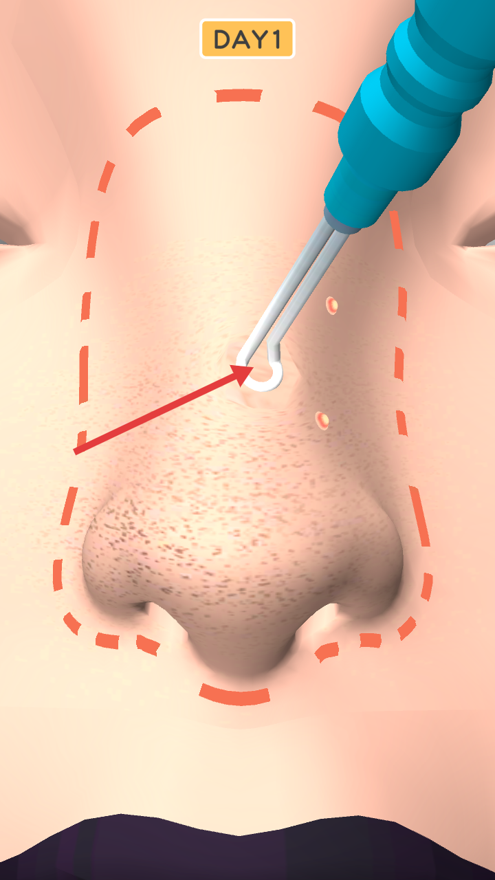 2、根据红色箭头方向,操控蓝色工具对准鼻头区域,执行相应操作,推进【DAY1】的游戏进程。
