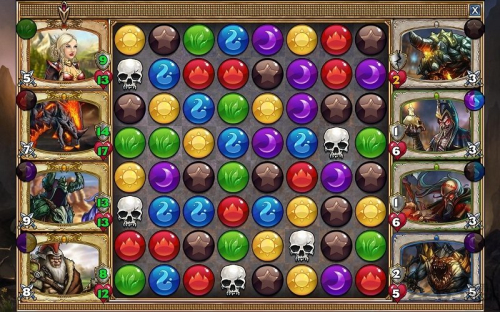 1、基础玩法,玩家通过匹配三个或以上相同颜色宝石激活技能,匹配骷髅头可直接攻击敌人,逐步击败对手。