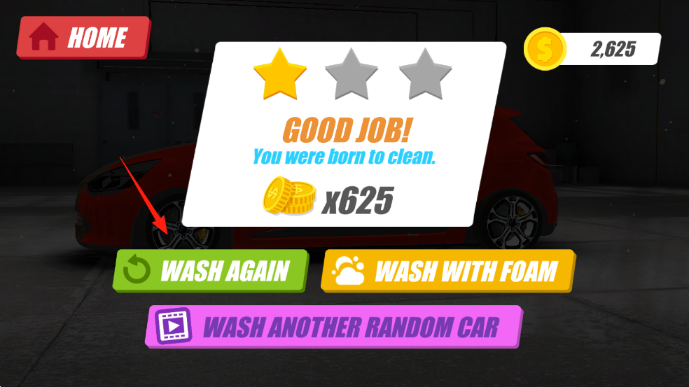 3、完成洗车后,会获得金币奖励,若想继续洗车,可点击【WASH AGAIN】再次清洗当前车辆。