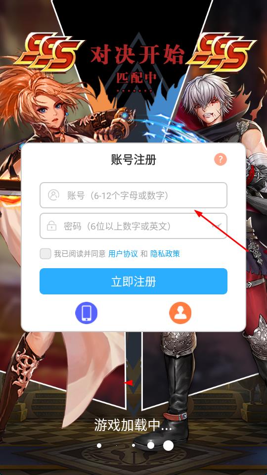 1、初入游戏,输入自己的游戏账号或者手机登入填写6-12个字母或数字。