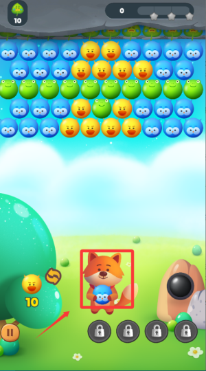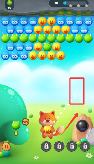 1、游戏开始后,屏幕下方会有一个发射器,拖动手指调整角度,松开手指发射泡泡。