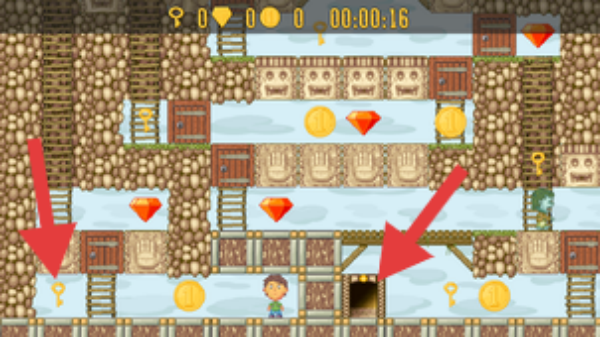 2、操控角色在关卡中,收集箭头指向的钥匙,拿取金币、钻石,避开陷阱,抵达出口。