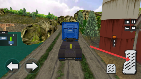 3、操控车辆时,点击右侧油门踏板(红色箭头指向),控制卡车前进,沿着道路行驶完成关卡。