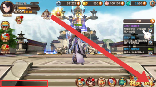 1、进入游戏主界面,点击箭头指向的【挑战/战斗】按钮,可参与战斗玩法,依据任务指引(如与镖师交互)推进,提升战力。