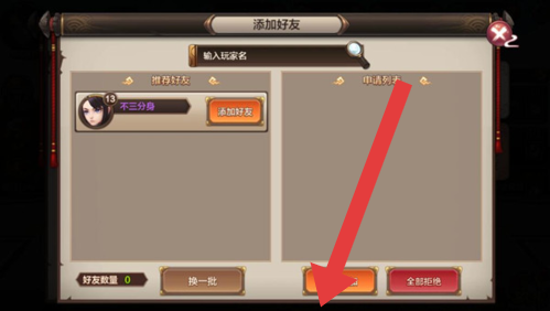 3、添加好友界面,跟随箭头,点击对应按钮处理好友申请(如添加/拒绝),拓展社交,组建团队或交互。